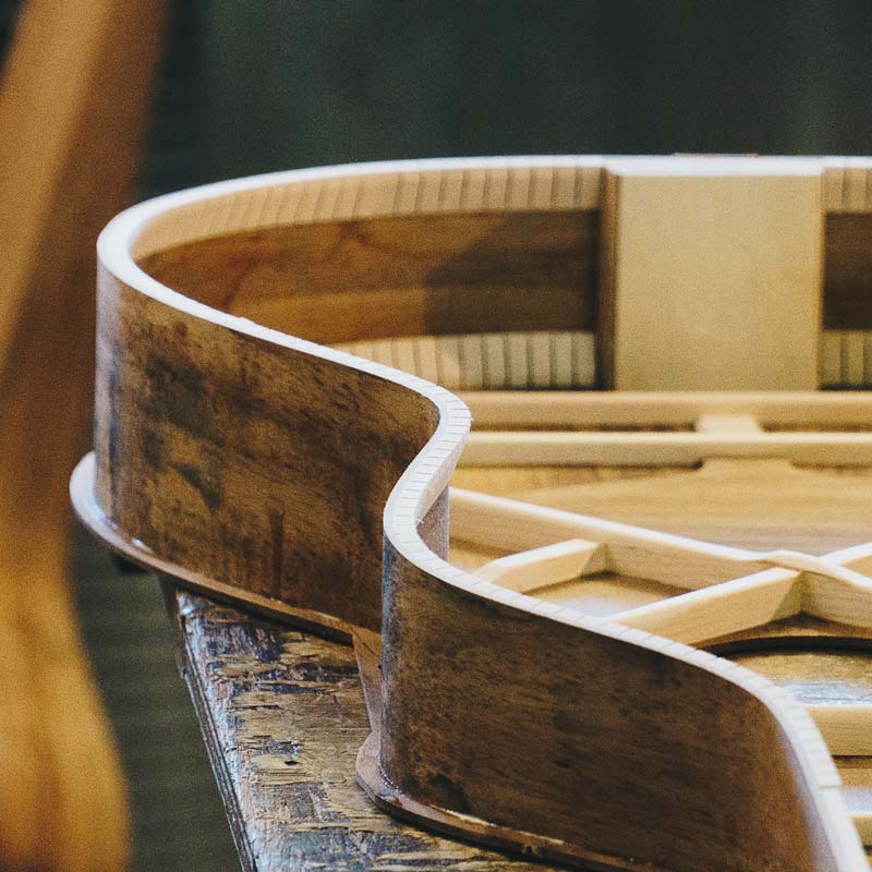 Sides are dimensioned and then painstakingly bent to our iconic Weissenborn shape using a delicate blend of heat and moisture in our unique bending mould. Soundhole rings and rosettes are seamlessly glued into precise channels in the top before being carefully scraped flush.